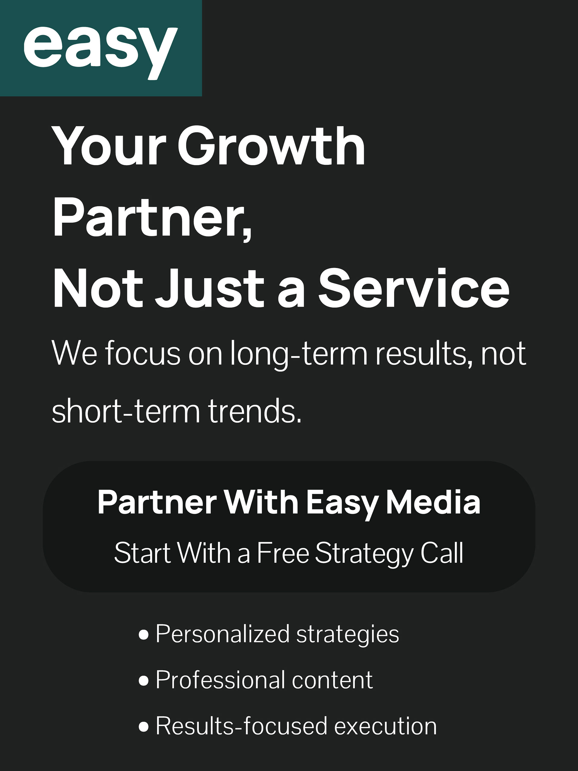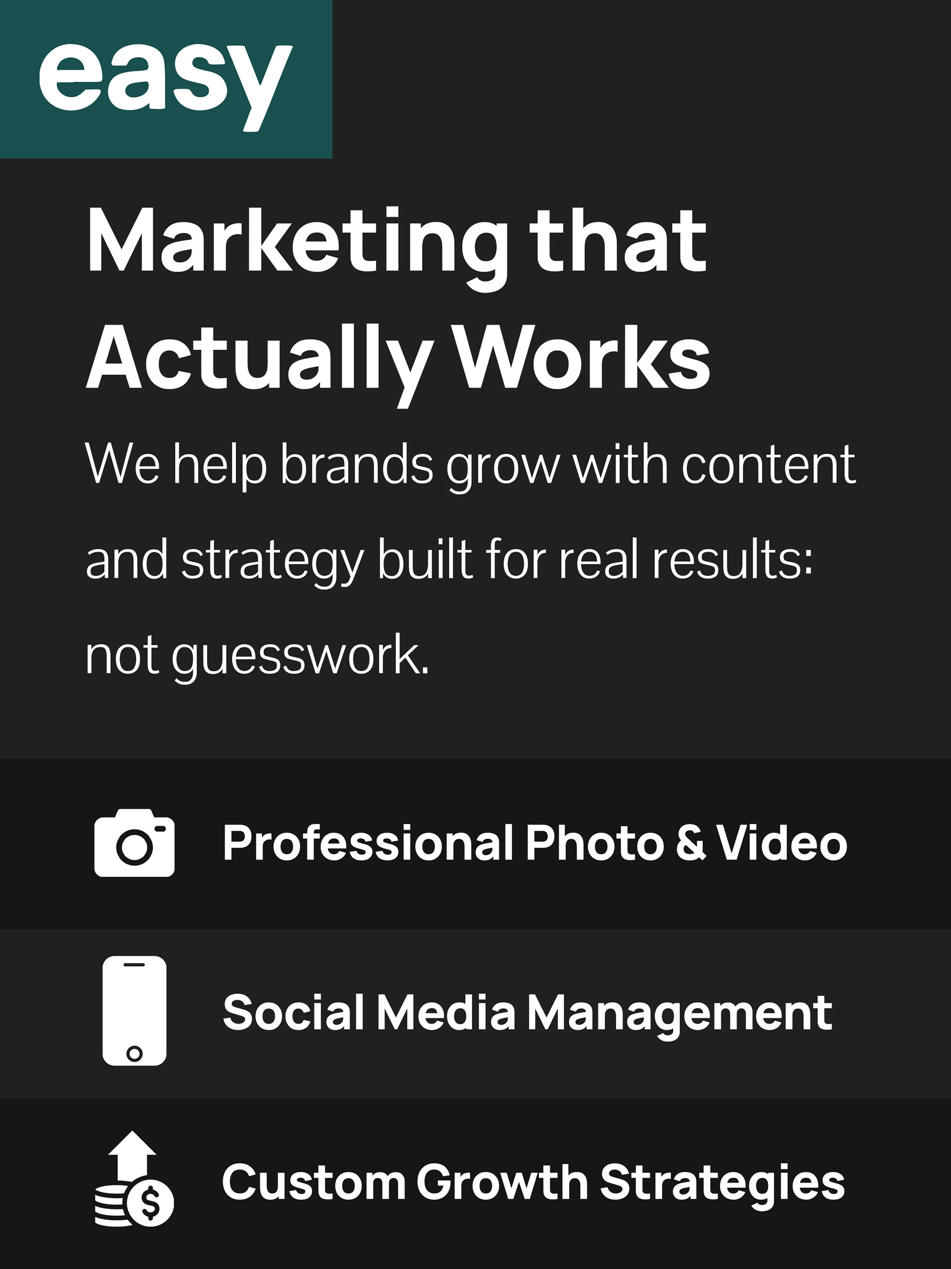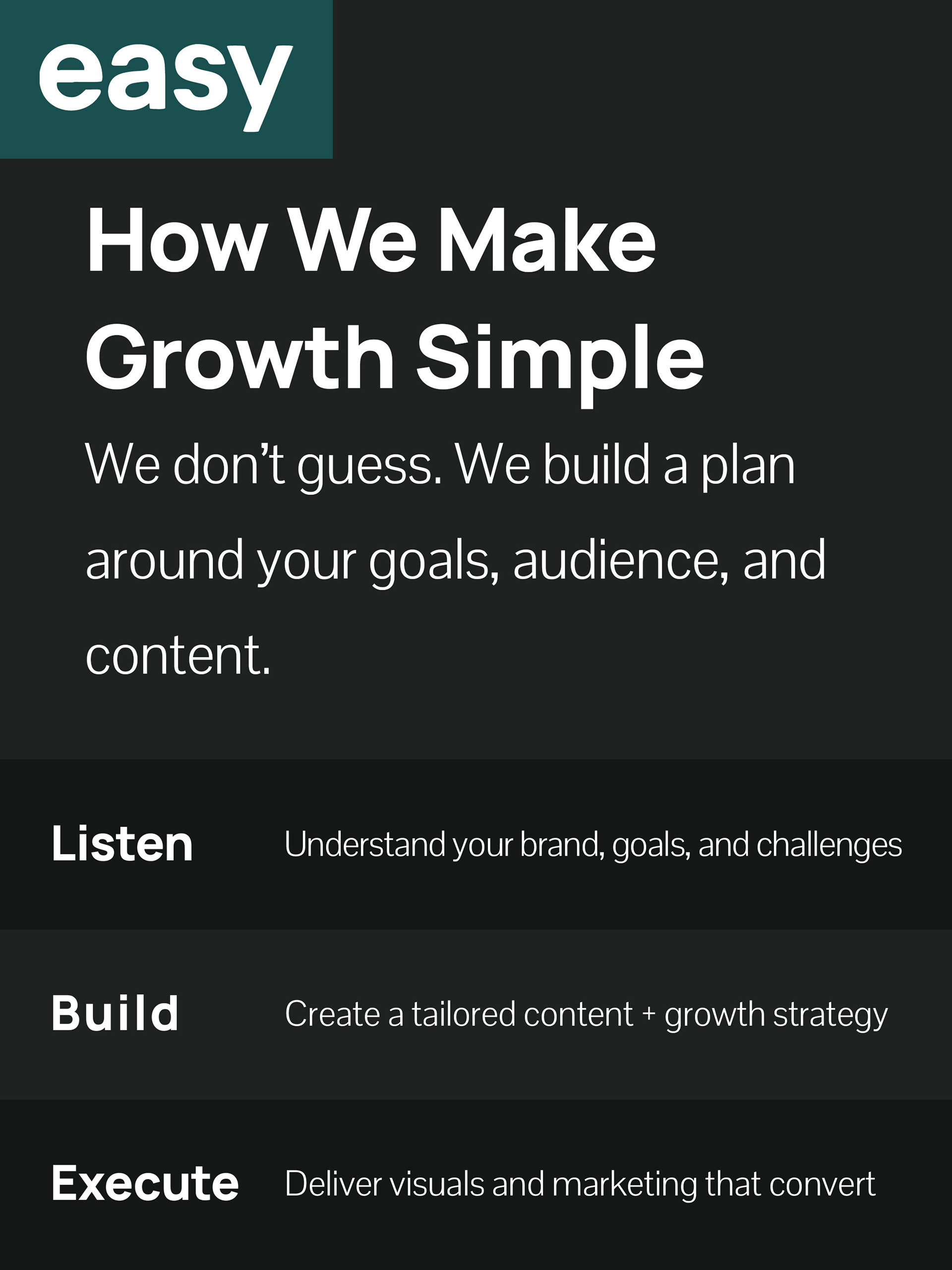 My approach centered on clean, typography-driven layouts supported by minimal graphic elements to emphasize clarity and confidence. Each design decision was made to support Easy Media’s messaging around strategic growth rather than short-lived visual trends. Social media carousel layouts were structured to guide viewers through a clear narrative, beginning with identifying a problem, followed by an explanation of the process, and ending with a strong call to action.