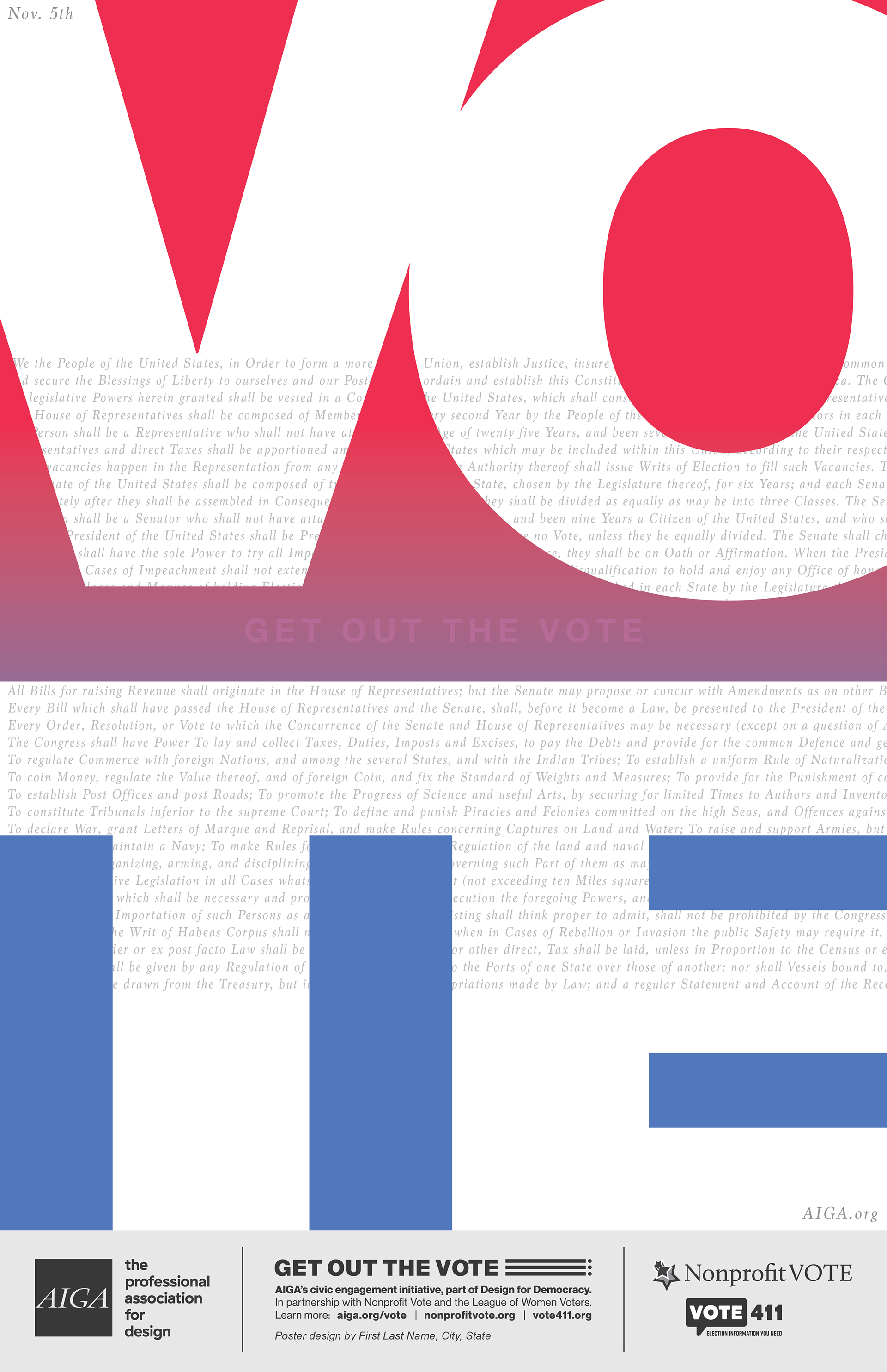 AIGA “GET OUT THE VOTE” 2024 poster design, composed during the Fall/Winter 2024 semester in Graphic Design Studio 1, taught by Christopher Previte. All elements of this poster were designed within Adobe Photoshop and Adobe Illustrator. This poster was created for the AIGA's voting initiative, as a component of "Design for Democracy". The poster design features large letterforms spelling out “VOTE”, and containing small print of the US Constitution within.